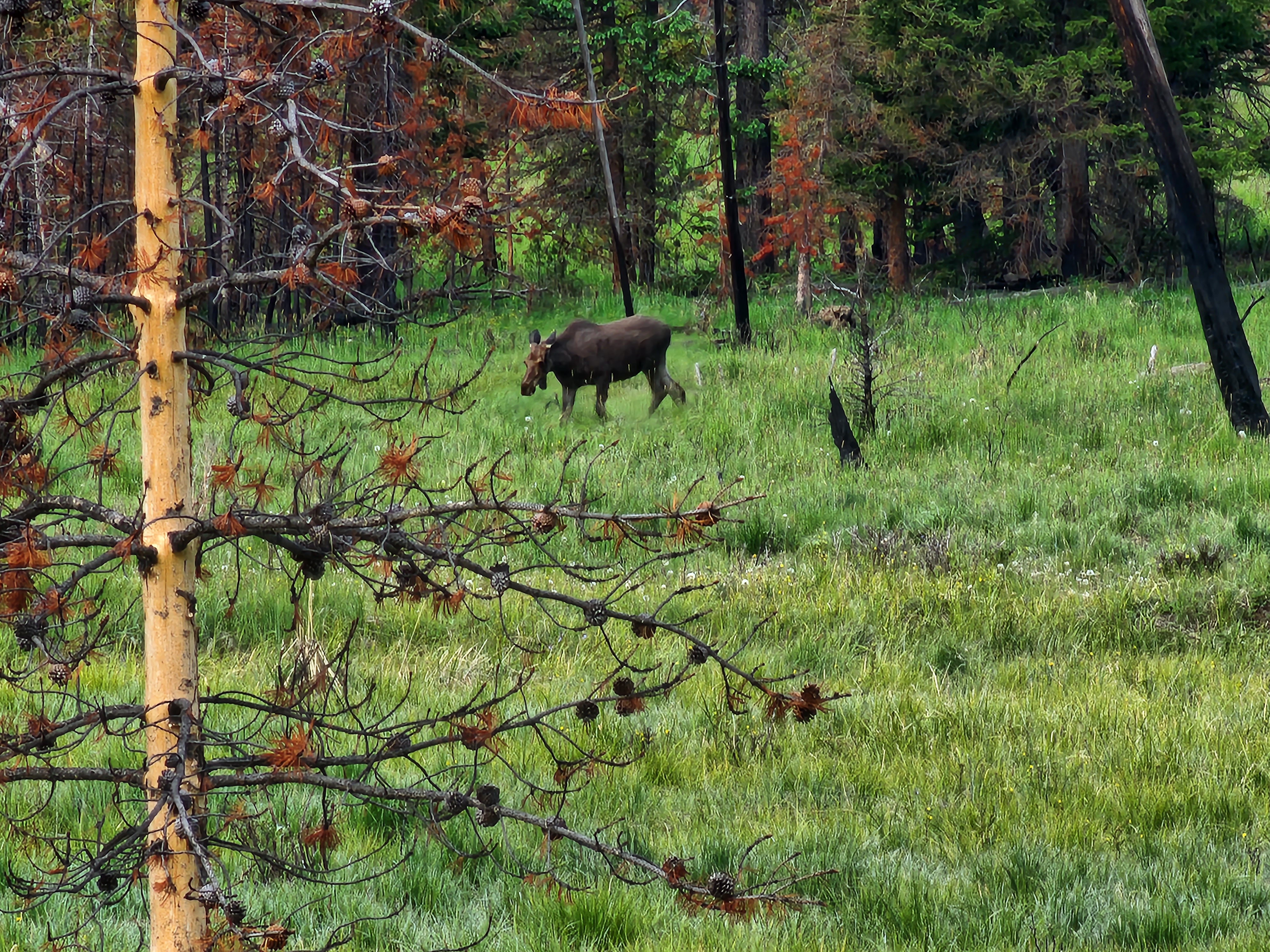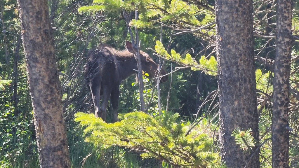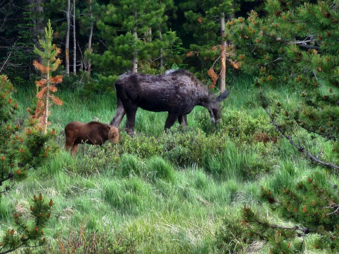 Descending back into Kawuneeche Valley, we came upon some cars pulled over. We slowed down to see what they were looking at and, sure enough, it was another moose!!